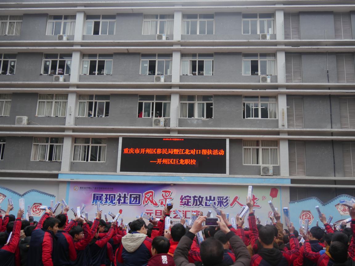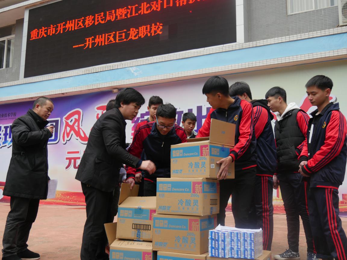 2018年1月17日,开州区移民局与重庆市江北区在我校举行了对口帮扶活动。开州区移民局十分重视和支持我区的职教事业,除了在办学方面、培训方面的指导和大力支持外,还积极联系和邀请其他地区和部门对我校进行物质上的援助。日前,通过移民局联系的重庆市江北区的一批帮扶物资,运抵我校,顺利发放到了全校学生手中。