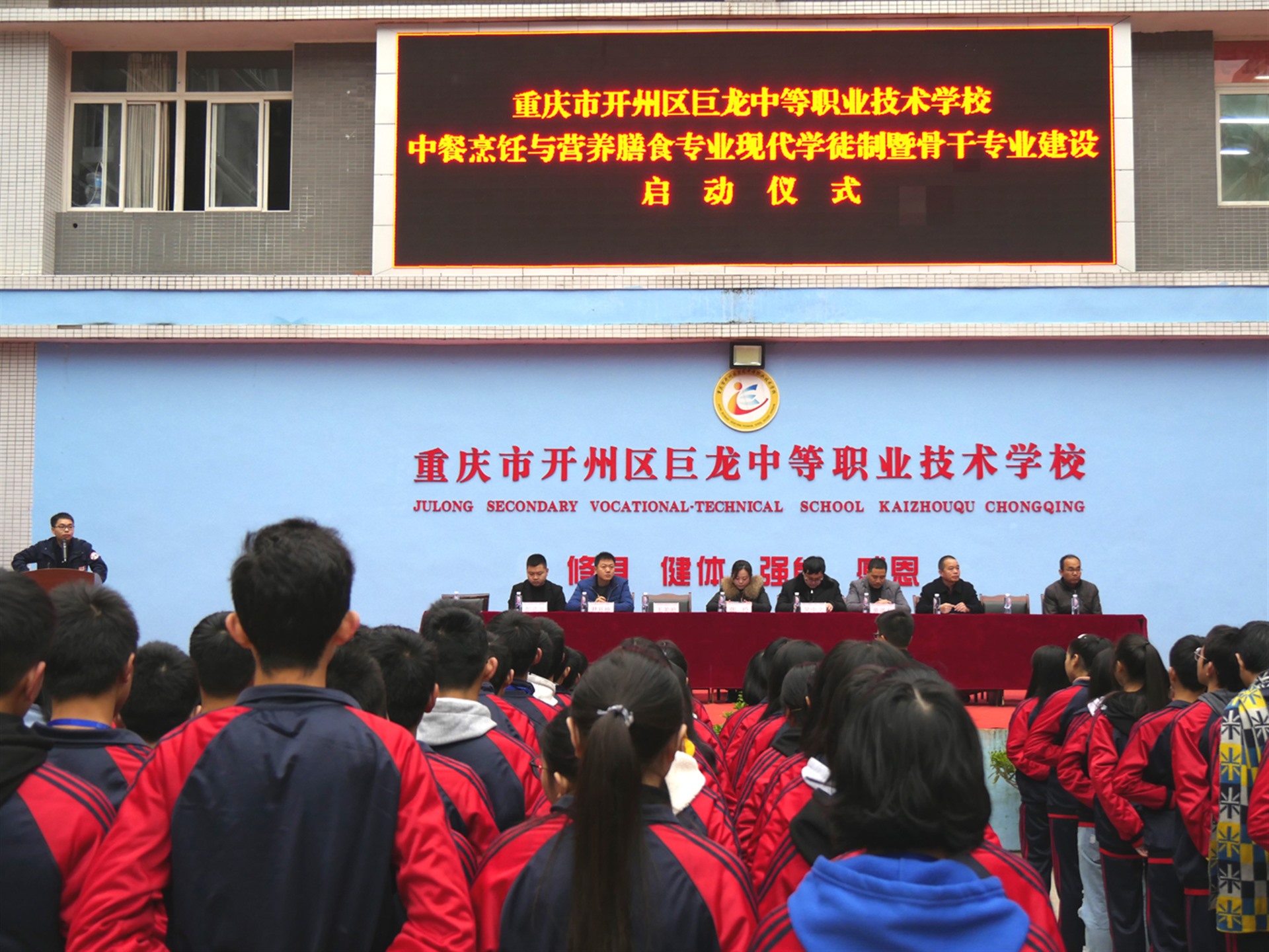 为贯彻落实《国务院关于加快发展现代职业教育的决定》和《教育部关于开展现代学徒制试点工作的意见》有关要求,经重庆市教委组织专家择优遴选,开州区巨龙职校脱颖而出,被列为全市开展“中职学校现代学徒制试点校”之一,其“中餐烹饪与营养膳食”专业入选全市首批“紧缺骨干专业”。 深化产教融合、校企合作,完善技术技能人才培养模式是现代职业教育发展的必然要求。近年来,开州区巨龙职校积极推行职业教育改革,在取得重庆市级重点中职学校和市级改革发展示范校之后,又以“中餐烹饪与营养膳食”专业建设为抓手,扎实开展重庆市“现代学徒制“试点工作。 按照《重庆市中等职业教育现代学徒制试点项目实施方案》和《重庆市中职骨干专业建设方案》,2018年12月15日,开州区巨龙职校实施的全市中职骨干专业建设项目和现代学徒制“试点工作全面启动。 全方位、多角度邀请相关专家会诊紧缺骨干专业建设方案
