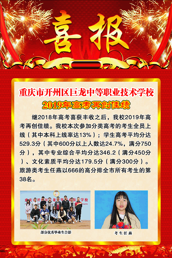 继2018年高考喜获丰收之后,我校2019年高考再创佳绩。我校本次参加分类高考的考生全员上线(其中本科上线率达13%);学生高考平均分达529.3分(其中600分以上人数达24.7%,满分750分),其中专业综合平均分达346.2(满分450分)、文化素质平均分达179.5分(满分300分)。旅游类考生任燕以666的高分排全市所有考生的第38名。
