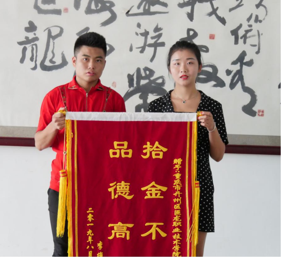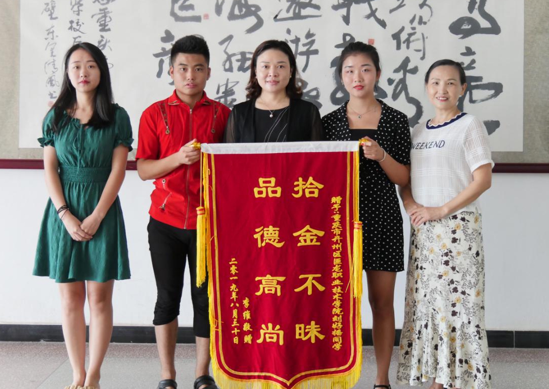 8月26日中午,我校2018级酒店管理专业学生刘好播在南雅—铁桥的公交车上拾到一个钱包,钱包里有现金1000余元,还有驾驶证、身份证、银行卡及车票多张。因一时找不到失主,刘好播同学就将钱包交给了当地派出所。在派出所的帮助下,迅速找到了焦急万分的失主,归还了钱包。 8月30日,钱包主人李维专程来到我校,送上一面特制的锦旗,表达他的感激之情。他动情地说:巨龙职校教育出的学生真的很不错,品德好,素质高,拾金不昧,为他人着想,这样的学生进入社会后,一定是好样的!感谢刘好播同学,感谢巨龙职校!