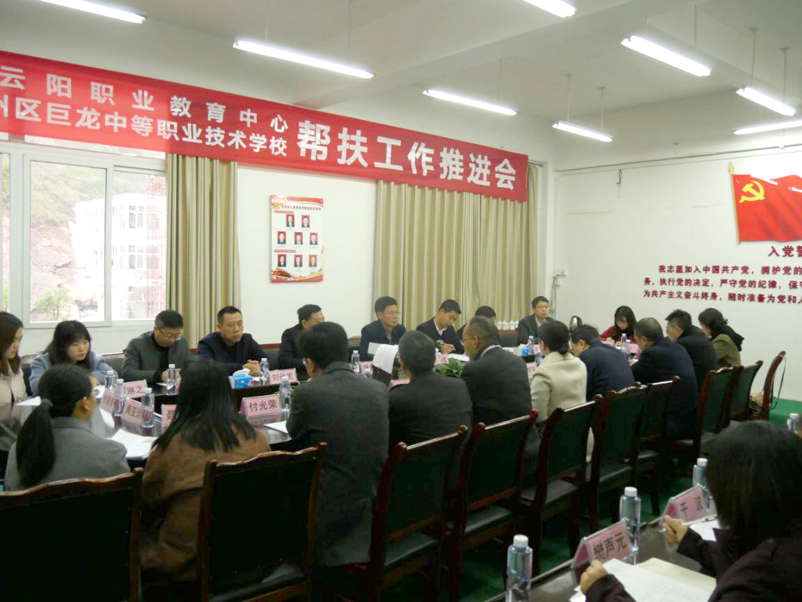 本次帮扶工作分两个阶段进行。第一阶段:帮扶推进座谈会。云阳县教委领导、云阳职教中心行政领导及教师代表、开州区教委分管领导、我校全体行政成员及教师代表参加了会议。