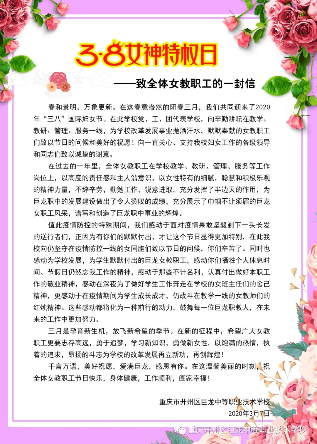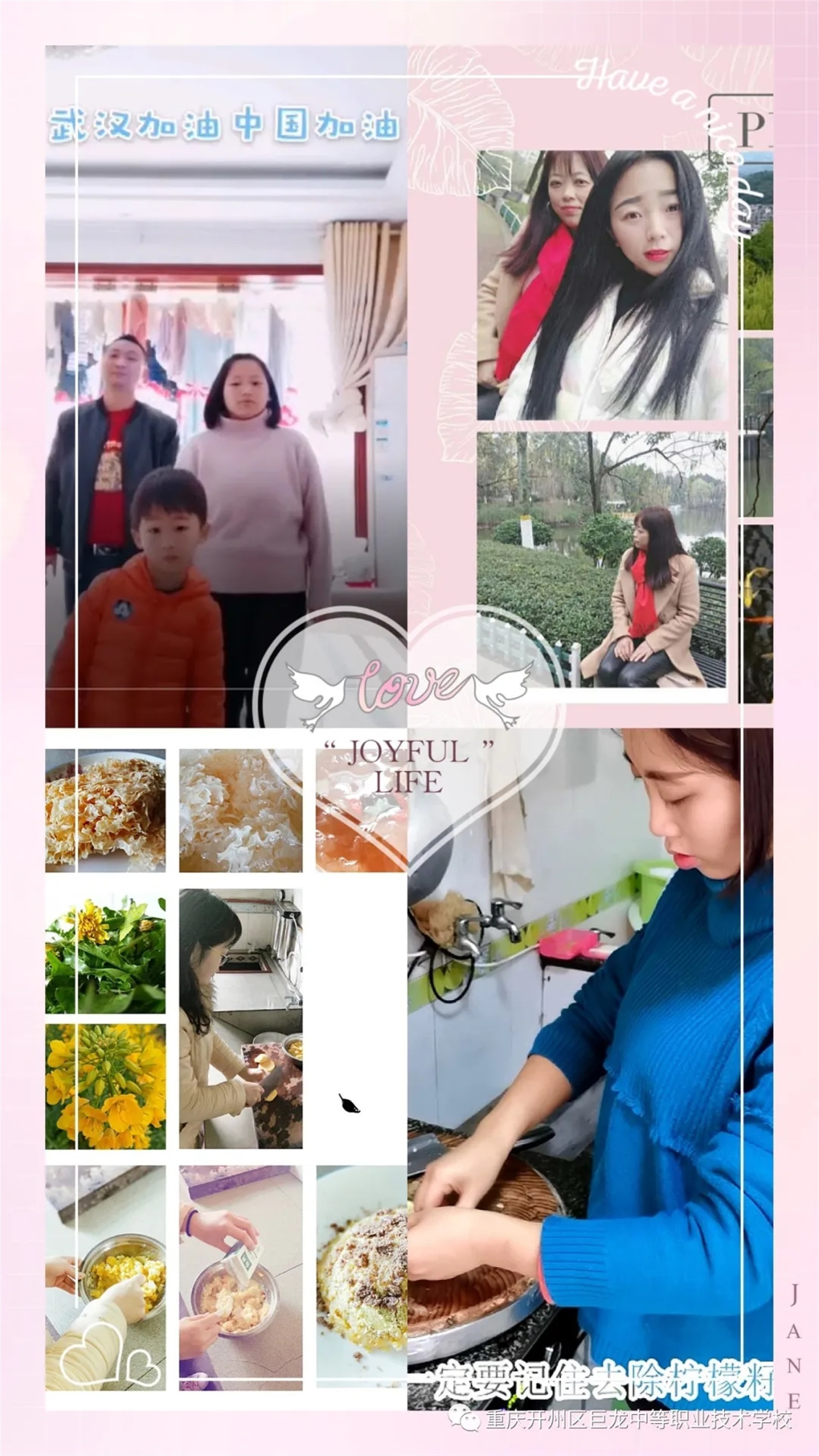 今年的三八节与以往不同,在抗击疫情的特殊期间,巨龙职中的女神们通过宅在家展厨艺、亮才艺等方式庆祝节日的到来,做到抗击疫情与庆祝节日两不误,既丰富了节日的氛围也为抗击疫情增添了信心。