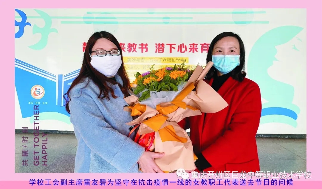 在这特殊时期学校校长陈小红携手工会副主席雷友碧,向坚守在抗击疫情一线的女教职工代表送去了节日的问候!肯定了她们为学校发展所作的贡献,对她们在疫情期间仍坚守在工作岗位的付出而感动,并在谈话中鼓励全体巨龙职中人要以她们为榜样,发挥主人翁精神为抗击疫情与学校发展尽职尽责。
