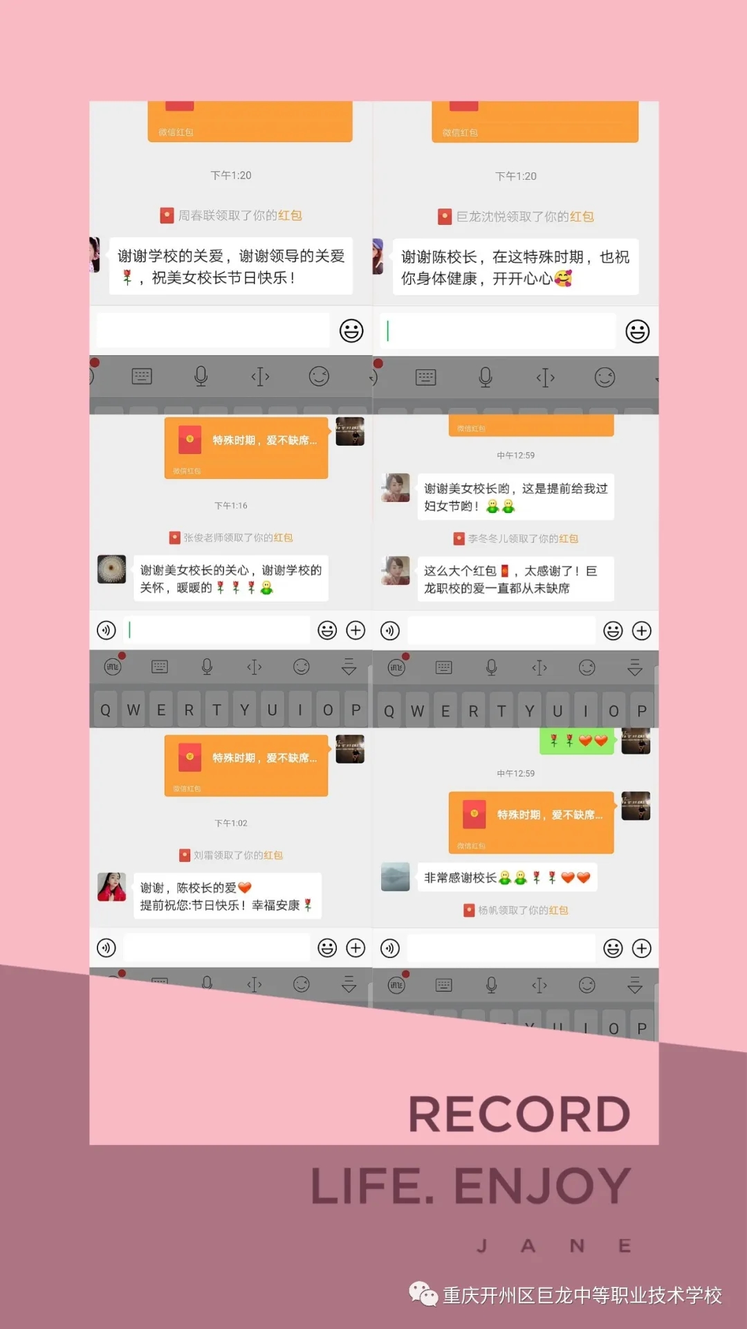 最让人感动与振奋的是来自学校为每一位女教职工精心准备的线上红包,正是因为这一份精心准备的小小礼物让她们感受到了温暖,同时也体现出了巨龙职中对家人们无微不至的关怀!
