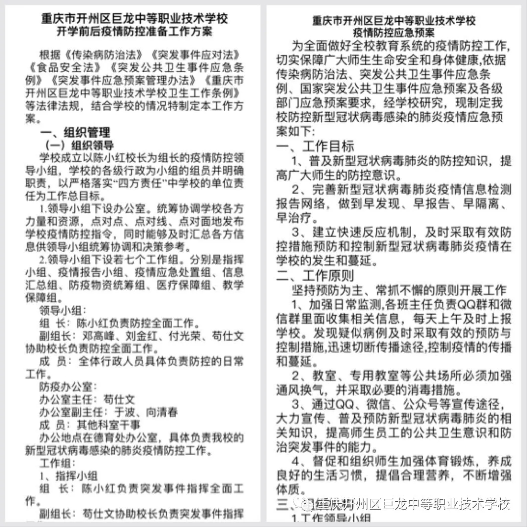 层级落实,真抓实干,精准发力。会后相继出台了《开州区巨龙职中开学工作方案》、《开州区巨龙职中疫情防控应急工作预案》,要求全校师生对方案进行解读与学习,层级落实、任务到人、明确责任、担当作为,全校人人都是疫情防控工作的“战斗员”。