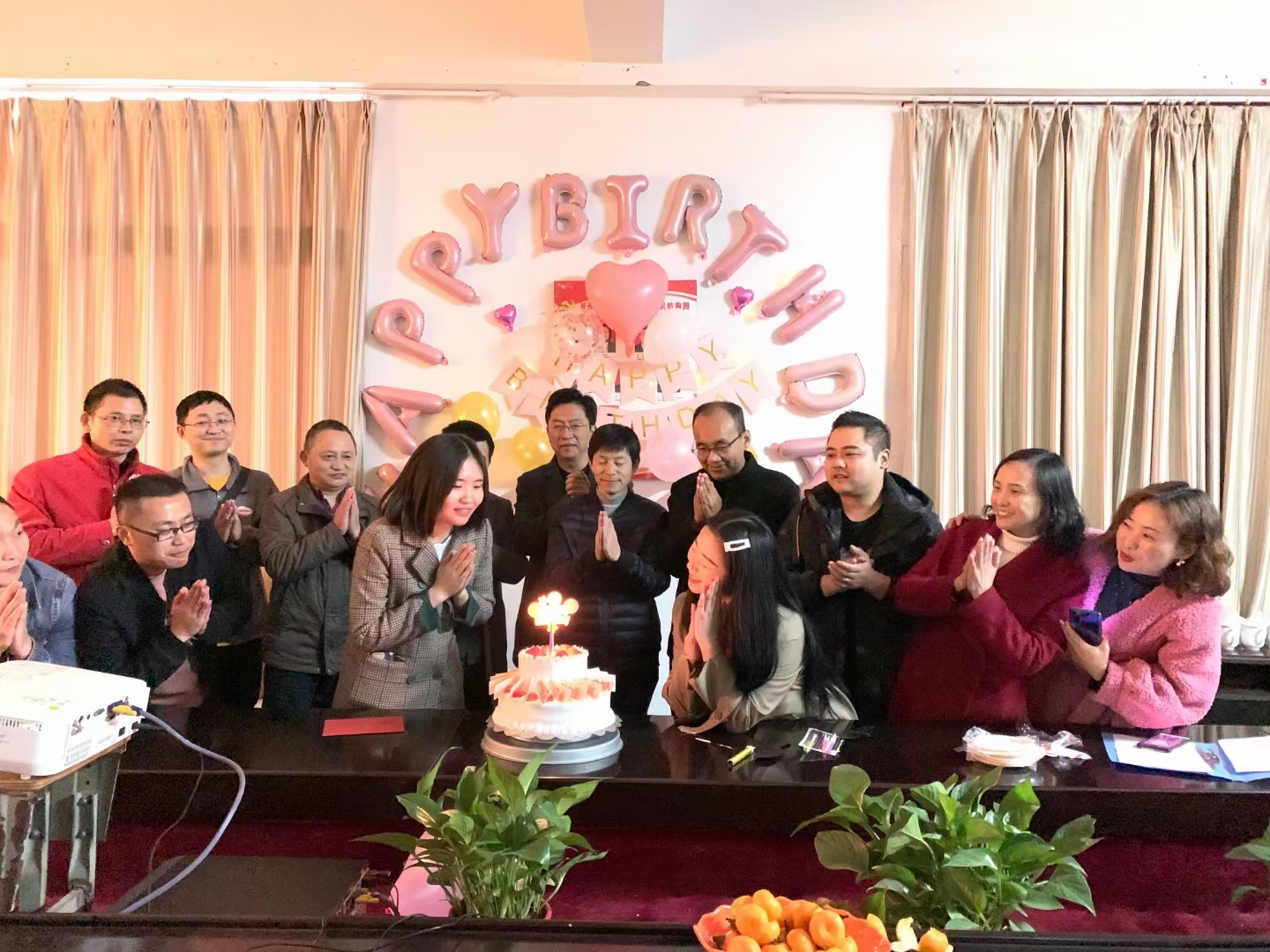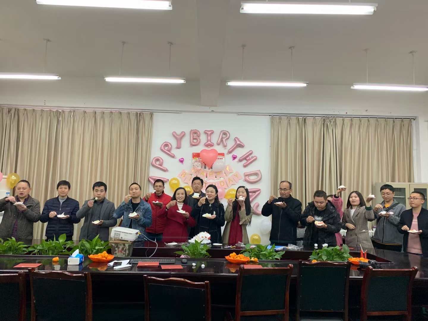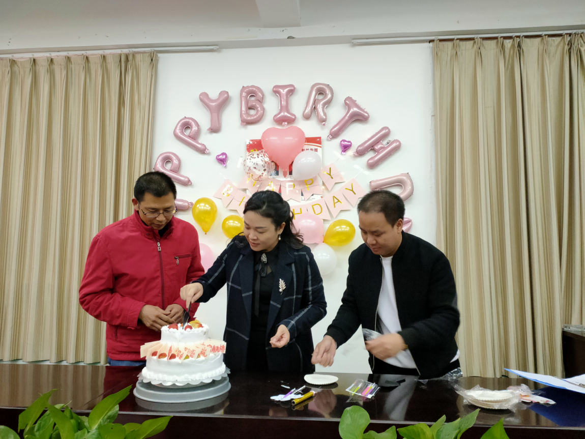 接着陈校长和综合办于波主任点燃了生日蛋糕,唱响了生日快乐歌。在悠扬的音乐中,大家相互送上了祝福与鼓励。